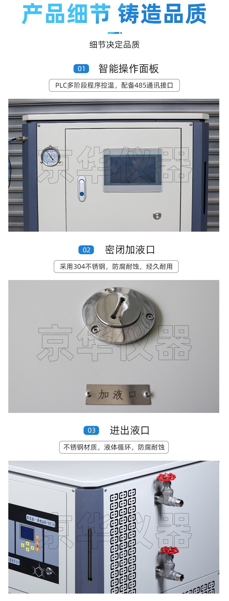 中型高低溫一體機裝置整個系統的液體循環是密閉的,系統帶有膨脹容器,膨脹容器和液體循環系統是絕熱的,不參與液體循環,只是機械的連接,不管循環液體的溫度如何,膨脹容器中的介質始終保持室溫。由于整個液體循環是密閉的系統,所以低溫時沒有水汽的吸收,高溫時沒有油霧的產生。公司可以提供工作溫度很廣的導熱油,...